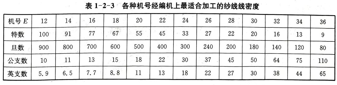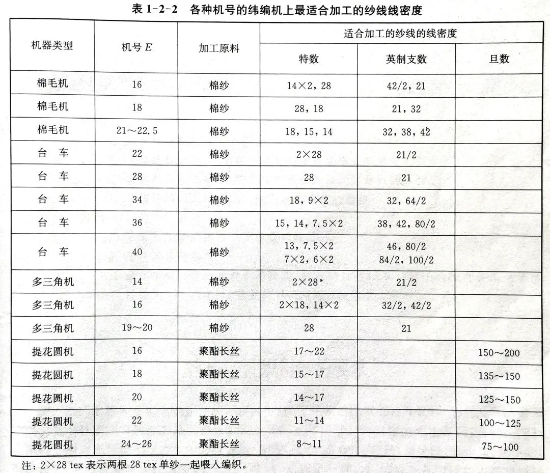 在實際生產(chǎn)中,一般根據(jù)織物的有關(guān)參數(shù)和經(jīng)驗確定機號的針織機上最適合加工的紗線線密度,如表1-2-2所列為各種機號的緯編機上最適合的紗線線密度,表1-2-3所列為各種機號的經(jīng)編機上最適合的紗線線密度。