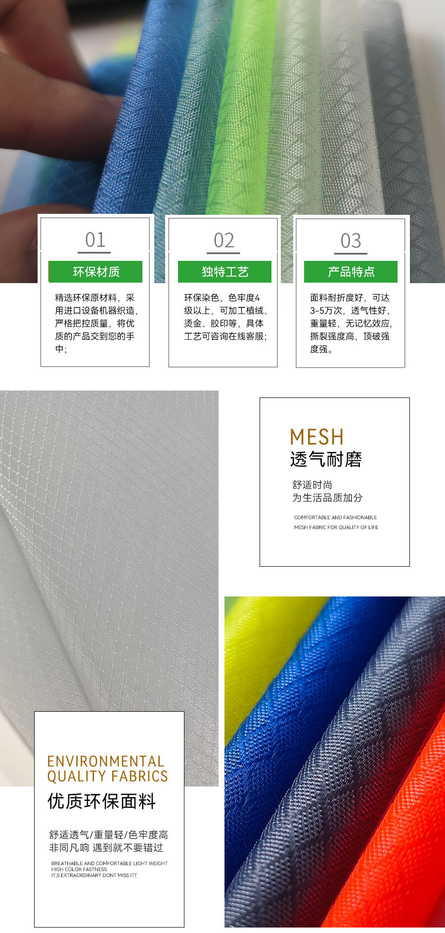 優(yōu)點是透氣、韌性足、耐磨、耐腐蝕。面料使用壽命長。非常適用于運動鞋、休閑鞋、帽子、沙灘包等產(chǎn)品。